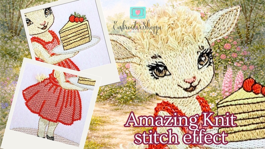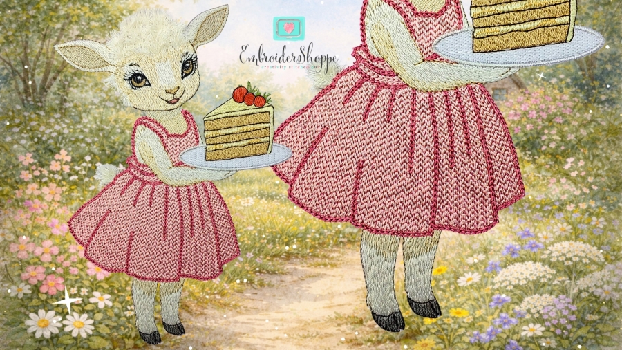 She wears a beautifully detailed vintage gown brought to life with rich knit-stitch texture, while her woolly features are enhanced with soft 3D fringe embroidery, adding warmth, movement, and irresistible dimension. Even in a smaller size, every detail shines with heirloom quality and thoughtful artistry.