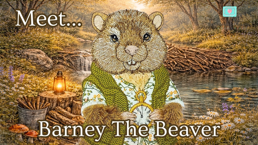Along a peaceful woodland stream, where golden light dances on the water and tiny ripples hum a quiet tune, lives Barney the Beaver — a gentle soul stitched with warmth, charm, and storybook magic.