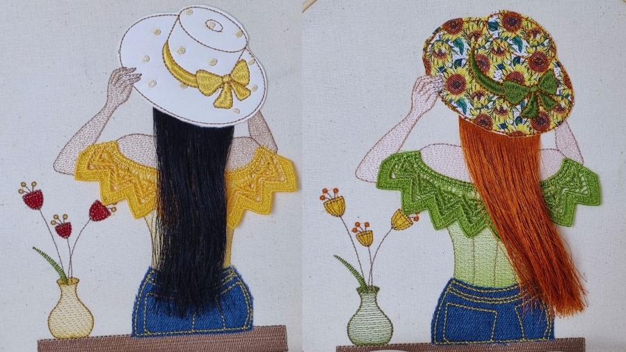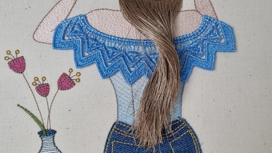 In this charming embroidery design, Emma sits gracefully on a park bench, holding her sunhat as she basks in the joys of summer. Her hair is intricately crafted using our unique jump style thread method, which adds a dynamic, textured flair to her look. Complementing her serene pose, her collar features a delicate free-standing lace enhancement, adding a touch of elegance and refinement to the scene. This design beautifully captures a moment of summer relaxation with artistic detail and sophistication.