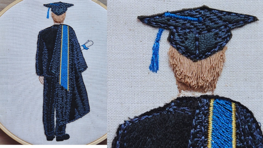 Tom stands proudly in his graduation cloak and hat, embodying the culmination of hard work and dedication. This machine embroidery design features his lifelike 3D hair, expertly crafted using the unique Zandra Jump Technique. The cloak showcases intricate details and is finished with raw applique, adding depth and texture to his celebratory look. This design captures the essence of achievement and joy, making it a perfect tribute to the graduation milestone.