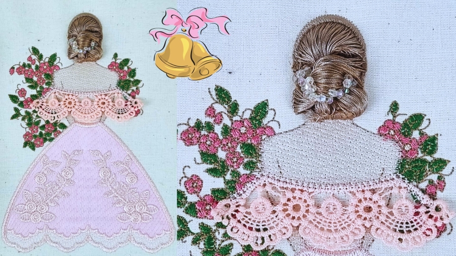This exquisite machine embroidery design features Danni standing gracefully in her wedding dress, holding a vibrant bouquet of flowers. Her hair is elegantly styled in soft curls using the Zandra's Jump technique, creating a beautiful updo that complements her look. The dress is adorned with an intricate lace pattern on the skirt, while a delicate free-standing lace collar adds a touch of vintage romance, making this design a perfect tribute to her special day.
