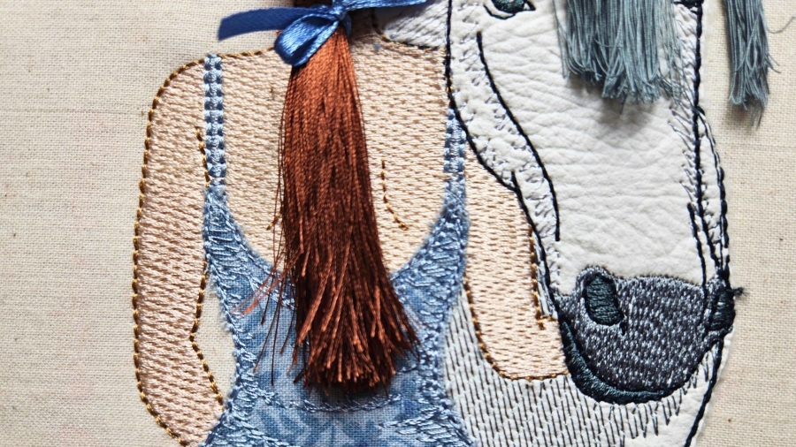 This delightful machine embroidery design features Lucy standing in a light summer dress next to her best friend, Flicka the horse. Lucy's long, beautiful hair and Flicka's flowing mane are intricately crafted using the unique Zandra Jump technique, allowing for versatile styling options—whether curly, braided, in a straight ponytail, or completely loose. This design beautifully captures the bond between Lucy and Flicka, celebrating friendship and the joy of summer.