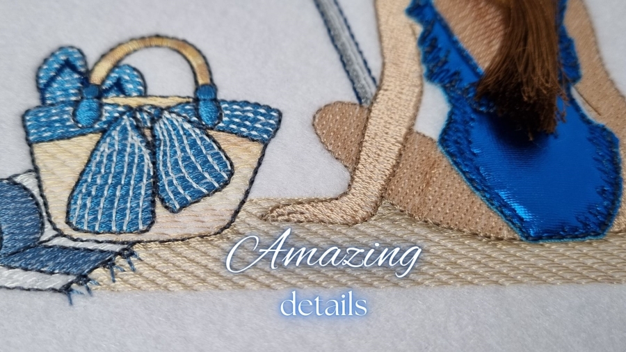 This charming and easy machine embroidery design features Zoë sitting on her towel at the beach, comfortably shaded under an umbrella as she soaks up the summer sun. With her flowy hair crafted using the Zandra Jump technique, she exudes a carefree vibe while watching her friends play in the waves. Dressed in a sparkly swimsuit adorned with stitched details, Zoë comes to life in this vibrant scene. Nearby, her basket and flip-flop are within arm's reach, ensuring she has everything she needs for a perfect day at the beach.