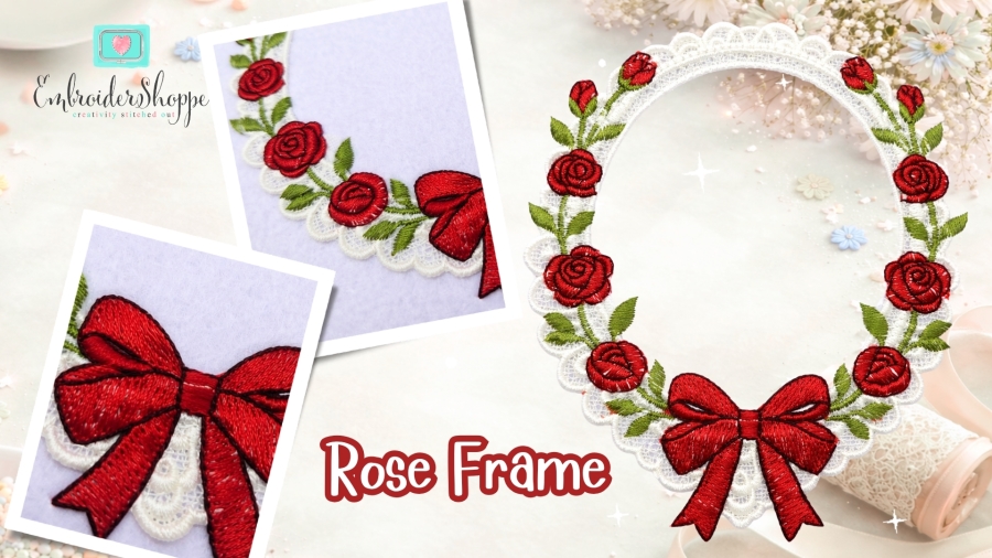 Step into timeless elegance with this stunning Rose Frame design — a beautifully detailed lace frame adorned with delicate roses, soft greenery, and finished with a graceful bow accent. This design captures the essence of classic romance, blending vintage charm with refined floral beauty in every stitch.