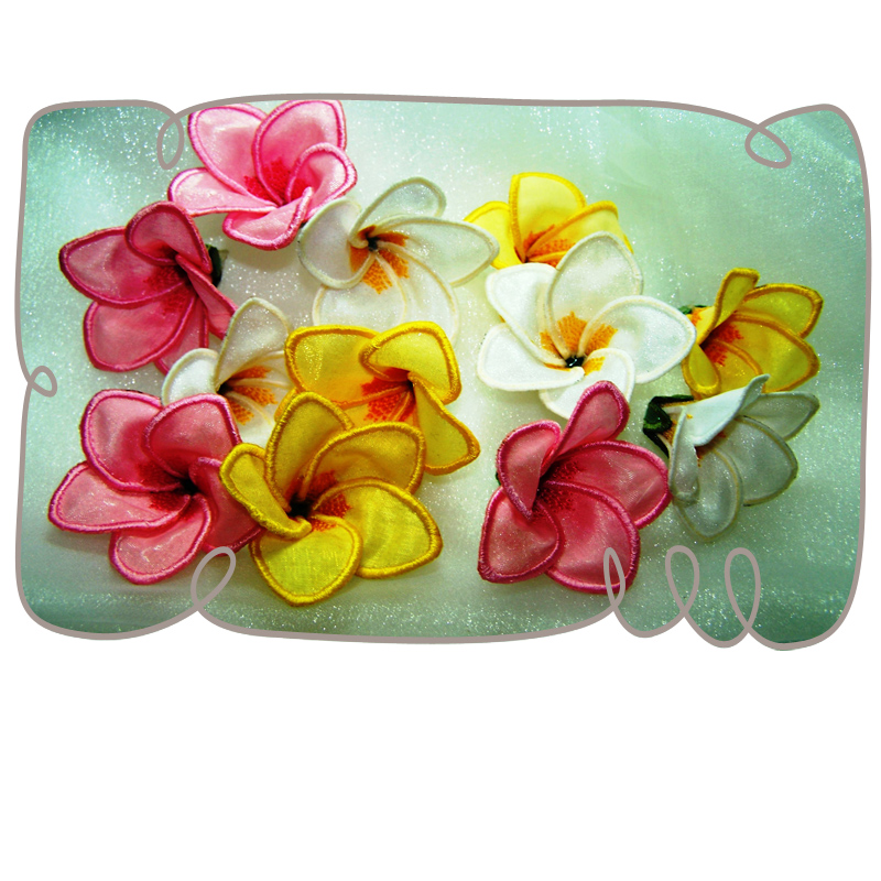 From our range of organza and poly cotton 3 -D flowers we proudly introduce, the thread and time saving, exotic frangipani. -