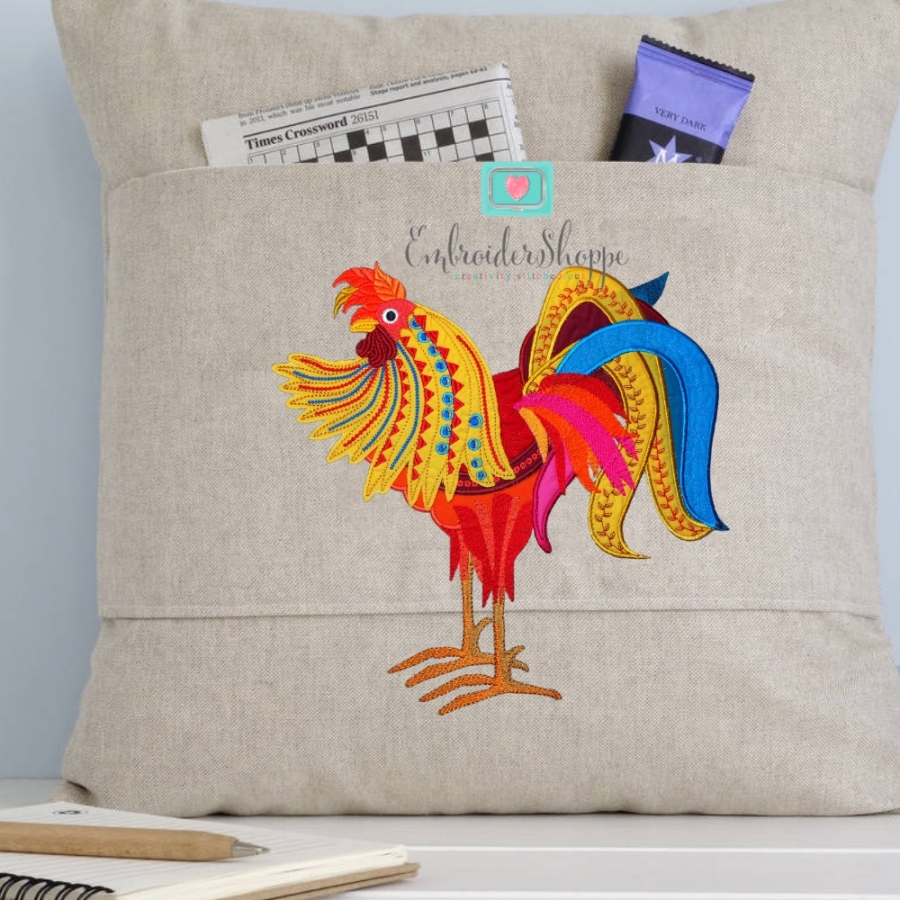 We proudly present this 10" x 10" beauty for the 6x8 hoop. The great news is that we combined several simple techniques to embroider the Rooster in four parts in 4 different hoops without multi hooping and with the minimum threads used.